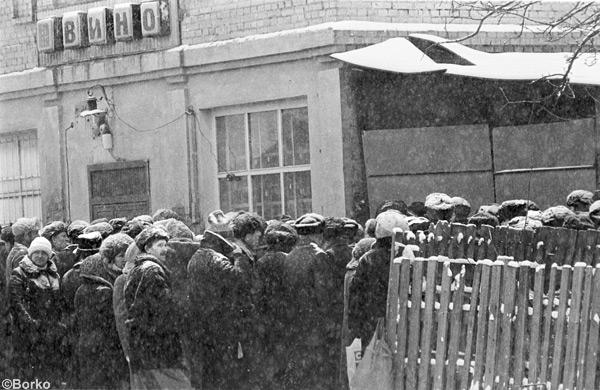 Вместо этого, вплоть до появления «национального проекта» под названием «Продовольственная программа», власть уверяла, что всё уже и так в полном порядке (имеются отдельные недостатки), что в переводе на русский означало «нам всё нравится, изменений не ждите». Не хочу сейчас вдаваться в тему экономики, в вопрос об адекватности цен, о соответствии роста зарплат росту производительности труда и т. д. Лучше вспомнить о тех дискуссиях, которые время от времени вспыхивают в Сети: кто-то выкладывает фото очереди (или бесформенной толпы) в остервенелом порыве штурмующей полупустой прилавок. Фото явно датируется каким-нибудь 1987 годом и тут начинается перебранка: «вот к чему привёл развал советской системы, свобода для спекулянтов и воров и демократия с кооперативами!», а им в ответ «рабы, «совки», так было все годы это проклятой власти, ничего не было и мне в очереди за этим ничего ногу отдавили, и больше 2 кг в одни руки не дали!» Выскажу своё сугубое «имхо» на эту тему. Представьте себе, что у Вас есть телевизор. То есть Вы-то, конечно, приличный человек и мыслящая личность и у Вас «зомбоящика» нету, но представим, для примера. Телевизор этот, в принципе, работает, но каждые полчаса по экрану бежит рябь, и нужно подойти и ударить по этому ящику из лакированной фанеры. Сбои годами происходят не чаще и не реже обычного, удар кулаком всегда эффективен, стабильность, «застой». Кто-то, имеющий в голове жёсткий концепт, каким должен быть «настоящий телевизор, достойный такого человека как я», от этой техники озвереет. А кто-то (автор этих строк, например) так всю жизнь проживет, и только посмеиваться будет, да каналы переключать пассатижами. Советская торговля периода «Застоя» – это такой стабильно нестабильно функционирующий аппарат. К закрытию магазина в продаже может не оказаться молока, вещи лучше покупать в конце квартала, когда универмагам нужно выполнять план и появляется дефицит, некоторые продукты скорее можно получить, работая на «стратегическом» предприятии, нежели просто зайдя с улицы в продмаг (в таком порядке вещей был кое-какой смысл в рамках советской парадигмы) и т. д. Но если знать и учитывать эти особенности, то питаться и одеваться можно было вполне. Теперь «Перестройка»: «телевизор» сбоит чаще, удар кулаком не лечит, то звук, то «картинка» пропадает и т. д. Ясно, что машинка на днях сдохнет и мы останемся без программы «Время» и вечерней фильмы про знатоков в 21:40. При этом денег на новый «Горизонт» нет. Для тех, для кого «ящик» и так числился в «не телевизорах, а тумбочках с железками» разница, может, и не велика. Для остальных отличия серьёзны: только что «картинка» была, а теперь чёрный экран.