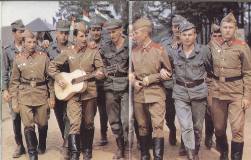 Тут всё не случайно. Помните, как писали в те годы: «простые советские люди сломали хребет гитлеровской военной машине». Люди – машине, хребет. Читай: победа жизни над смертью. И неслучаен образ мальчика-солдата с простым и открытым лицом, чья чистота и неспособность к предательству, обладает магической силой того же рода, что была у легендарных девственниц, усмирявших буйных единорогов. Быть может, такой представляли свою молодость «властные старики», быть может, в этом они видели источник настоящей, неподдельной непобедимости. Только «мальчикам», надевавшим военную форму, примерять на себя ещё и этот тонкий и жертвенный образ хотелось не сильно. И страшно и «не круто». Куда веселее почувствовать себя бронебойным суперменом. Между тем, персонажей, на которые хотелось бы походить пацанам, было на удивление мало. Если посмотреть с этой точки зрения, на ещё один пункт, который считается подтверждением «агрессивной природы» позднего СССР – культ Великой Отечественной войны и вообще обилие военных в кино, то картина получается вовсе противоречивая. Настоящий милитаризм затушёвывает трагизм войны либо весёлой удалью Фанфана-Тюльпана либо варварской энергетикой Шварценеггера, подсовывая образы неуязвимых, непобедимых, удачливых, с которыми так легко и приятно себя идентифицировать. Советский кинематограф начинал «нащупывать» эту тему в 50-60-х, формируя довольно интересный тип героя – отважного, обаятельного и чуть лукавого простака, такого как Иван Бровкин или Максим Перепелица («Там, где пехота не пройдёт и бронепоезд не промчится, Максим на пузе проползёт и нечего с ним не случится»). Лыко в ту же строку – беззаботная военная комедия «Крепкий орешек» (с Соломиным, а не с Уиллисом) и даже вроде как «диссидентская», окуджавская «Женя, Женечка и «катюша»». Но постепенно (условная точка перелома – фильм «В бой идут одни старики») в образе солдата начинают преобладать черты не вояки, а страстотерпца, сама война оказывается страшной кровавой страдой, крёстной мукой. Акцент делался не на победном пафосе, а на цене, оправданной, безусловно оправданной, но неимоверно, чудовищно страшной. Воины Сергея Бондарчука или Ивана Лапина – это не те, кому хочется подражать, а те, перед кем нельзя не преклоняться. Это момент относительно тонкий: в своем предельном выражении готовность к подвигу и почитание героев оказывались противоположными вещами. Да и ещё один штрих: вспоминается, что после фильма «Случай в квадрате 36-80» какая-то западная газета напечатала статью, где главный герой назывался «элитным солдатом, чья униформа безупречна даже в гуще боя» и «русским ответом на Рэмбо». Знали бы вы, какой нервное опровержение на несколько полос вышло в советской прессе. Конечно, могут припомнить, в качестве аргумента в пользу утверждения о милитаризованности советского общества, особенности воспитания школьников: пионерская организация (классическая полувоенная структура на очень посторонний взгляд), «Зарница», смотры строя и песни.